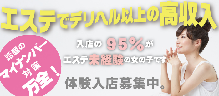 はじめまして求人担当です (*^▽^*) 他の風俗エステ店と違い、キスや体へのリップサービス・オールヌード・顔面騎乗・密着洗体・水着プレイ・混浴などなど性的にハードなプレイは全て禁止!! そんな当店は 『ハンドサービス専門(舐めない・脱がない・触られない)』 のメンズエステ店です(^^) ですので… “性病”の心配が一切ありません♪ ローション、オイルはもちろん! 制服、タオルに至るまで 全て「無料」で準備しておりますので まずはお気軽に【体験入店】から いかがでしょ~か? m(^^)m ※ P.S. 最近話題の「マイナンバー制度」の対策も万全です! 当店での勤務が、ご家族やお勤め先へバレることは100%ありません♪