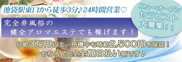 日給3万円以上!待機時給2500円保証します♪池袋にニューオープンのアロマエステ「桜坂」です♪ 完全新規店ですので、キレイでピカピカな内装♪ 簡単なマニュアルですぐに覚えられるサービス内容ですので、難しい研修などは御座いません! また、当店は健全なエステのお店ですので、性的サービスは一切ありません。 未経験の方も安心してご応募下さい♪