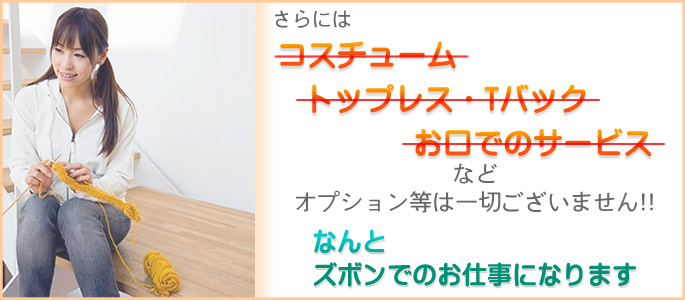当店は本当に「脱がない・舐めない・顔出しなし」を徹底しています それは営業用ホームページを見て他店と比べて頂ければ一目瞭然、トップレス等の余計なオプションは一切ございません。風俗はしたくないけど高収入は ほしいという方!まずは安心できる環境でお仕事できる当店から スタートしませんか?