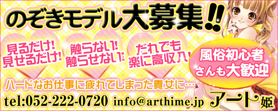 ■誰でも超簡単♪名古屋で超人気の のぞき部屋だから、【安心】【安全】【見せるだけ】【触られない】お店ですから ヘルスやエステ店のような受け身や手コキサービスは一切なし!! 【年齢や容姿を気にせず、主婦や熟女さんも高収入をお約束】 ☆☆☆短期アルバイト・短時間出勤大歓迎☆☆☆ 超簡単!! 高収入のぞきモデル大募集!! 年齢や容姿を気にせず働けますよ♪ ◎◎◎ここがポイント◎◎◎ 年齢や容姿を気にせず働けますよ♪ OL・主婦・熟女まで幅広い年齢層で募集しています。 ■18歳以上、OL・学生・主婦40代の女性でも安心して稼げるお店です!! たった10分間 脱ぐだけ☆ 見せるだけ☆ 風俗未経験の初心者さんも安心して稼いで頂きます。 お約束します。 男性客様には触りません、絶対触られません。本当に見せるだけです。 病気の心配が全くない為、リスクなく働いて頂ける上、気持ちの上でも彼氏さん、旦那さん、身内の方々に対しても、男性とのからみがないだけにストレスなく働いて頂けると思います。 ・女性スタッフによる簡単な講習 ・自由出勤制。週1回、月1回、短時間でもOK。 ・個室待機 ・女の子に優しいアットホームなお店なので、わずらわしい人間関係は一切ありません。 ・面接の後すぐに体験入店可能です。体験入店でも通常のお給料を、その日に全額お支払いします。 まずは面接からスタートです。面接希望日時をお気軽にご相談ください。 info@arthime.jp 052-222-0720(14:00~23:00)