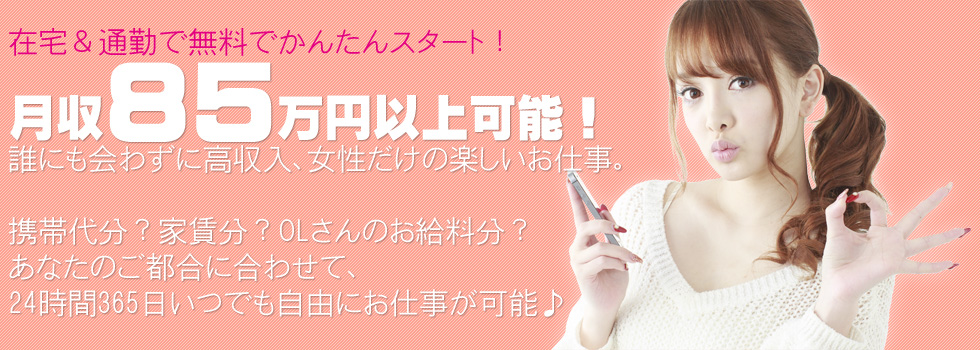 チャットレディのお仕事は、画面越しなので男性と接触することは一切ありません!なので、会わない・触らない・触られないの超簡単高収入業務として、凄く人気のお仕事♪顔出しが嫌な方は、顔出しをしなくても大丈夫です!出勤&在宅が自由に選べて安心・安全あなたの好きな時間だけで好きなだけ稼げます。日給2万円。月収85万円以上可能。しかも副業でも大丈夫なので本業の傍らで本業以上の収入が可能!