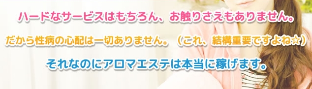 当店は、まったくハードサービスがありません。オールヌードもありません。多くのエステ店は、オプション表記にてキス・フェラ・口内発射・指入れ等が設定されていますが、 当店は、制服姿にて手コキによるフィニッシュまでのお店でタッチは一切NGです。何より、サービス内容が簡単なので精神的に負担が掛からないのがアロマエステです。