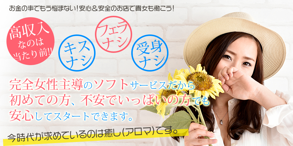アロマオイル、高級無香料オイルなどを使用してのオールハンドでのお仕事です。当店は本格アロママッサージが主体のお店なので 女性が受け身になることはありません。オプションも、出来る出来ないは自分で選べるので 初めての方でも『安心』で『優しく』お仕事ができます!優しいスタッフが親切・丁寧に対応させていただきいただきます。