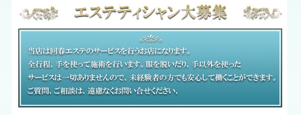 五反田の老舗エステ店・安心と実績があります☆ハンドサービス以外のサービスは100%ありません。もちろん男性と一緒にシャワーを浴びたり、一緒のベッドで添い寝をしたりも御座いません。お問い合わせ後すぐの1日体験入店も大歓迎です!