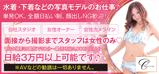 当プロダクションでは、ドレス・コスプレ・水着・下着などの写真モデルを募集中♪ 「自社スタジオ」「女性オーナー」「女性カメラマン」で安心です。 1回の撮影時間は最短で30分~、最低時給3,000円以上、撮影内容次第では日給3万円以上可能です! 1回だけの単発モデルでもOK♪もちろん全額日払い致します! 自社スタジオですので、24時間お好きな時に撮影OK☆ 身バレが心配な方もご安心下さい!プライバシー対策は万全です! 当プロダクションは写真モデルのみですので、AVなどの勧誘は一切御座いません。