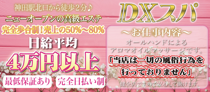 神田駅北口から徒歩2分の駅近エステ♪オールハンドによるアロマオイルマッサージをして頂くお仕事です。 当店は一切の風俗行為を行っておりません。未経験者の方には、専属女性講師からの研修があります(1日2時間程度)交通費支給、保証制度有り、送迎あり☆まずはお気軽にご連絡お待ちしております♪