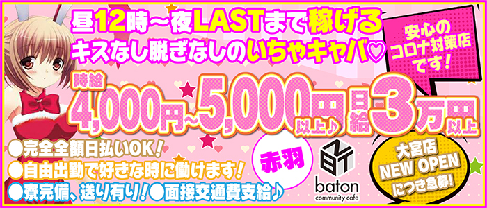 赤羽のいちゃキャバ「baton」です☆キスなし・脱ぎなしで時給5,000円以上☆体験入店でも全額日払い致しますので、金欠の方はお試しだけでも稼いでみて下さい♪面接は随時受け付けOKですので、お気軽にご応募お待ちしております!