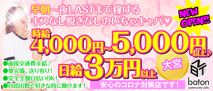 大宮の脱ぎなし・キスなしのいちゃキャバ「大宮baton」で稼ぎませんか?体験入店だけでも完全日払いします!もちろんお友達と一緒でも大歓迎ですよ♪まずはお気軽にお問合せください♪