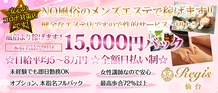仙台・国分町のメンズエステ「SALON REGIS 仙台」です!最高歩合が72%と、エリアトップクラスに稼げるメンエスです☆学生さんやOLさんの副業も大歓迎!11時~翌5時と朝まで営業しているので、掛け持ちにピッタリのお店です☆未経験でも女性講師が丁寧に説明しますので、安心してご応募下さい♪