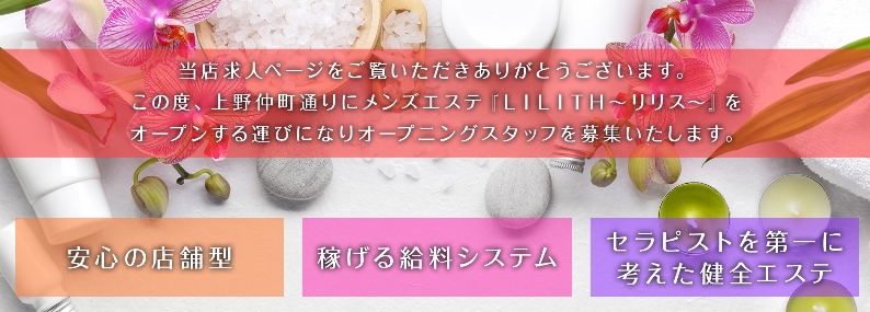 上野駅徒歩5分の健全メンズエステです!アロマオイルを使ってトリートメントを行います。風俗店ではないので性的サービスは一切ありません♪未経験の方も 専属の女性講師が丁寧に研修いたしますのでご安心ください☆当店は待機保証がありますので、出勤すれば仮にお客様が付かなくても必ずお金を持って帰れます!まずはお気軽にお問い合わせお待ちしております♪