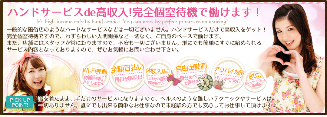 ★☆★貴女のやる気次第でどんどん稼げます!★☆★ ◆体験入店随時受付中!!面接したその日からでも働けます!◆ 待機時給保証 3000~5000円 必ず支給致します♪ マンガ喫茶のような個室でエッチなDVDを見て待っているお客様を、手だけのサービスでお手伝いするお仕事です。 普通のオナクラより時間もテクニックも必要ないので楽に稼げるんですよ♪ 指名ボーナスもございますので短期間で高収入を稼いで頂けます!