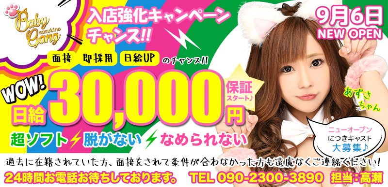 すすきののソフトキャバクラ「Baby Gang」はNO-キス・NO-トップレス宣言!!脱がなくていいんです♪もちろんそれでもしっかり高給与を用意していますよ!まずはお気軽にお問い合わせ下さい☆