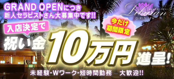 オープニングスタッフ大募集! 今だけもれなく10万円支給☆お仕事内容は、アロマオイルを使ったマッサージです。風俗店のような性的なサービス・行為は一切禁止しておりますので、安心して働けます!スタッフは女の子がお仕事をしやすい環境を第一に考えております。 未経験の方でも丁寧に指導致しますので、すぐに覚えて頂けます。 お仕事の事や、お金、プライベートの事等…何でも相談に乗りますので、安心してご応募ください。