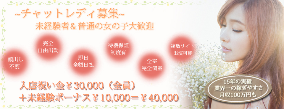 未経験者・パソコン初心者・他店&他業種で稼げなかった方歓迎♪入店祝い金3万円進呈♪未経験の方限定で更に1万円ボーナス♪面接交通費1,000円支給♪顔出し(選択自由)が心配な方は身元ばれなく稼がせます!お好きな食事&ドリンクも支給♪全く財布にお金がない方も安心してください♪