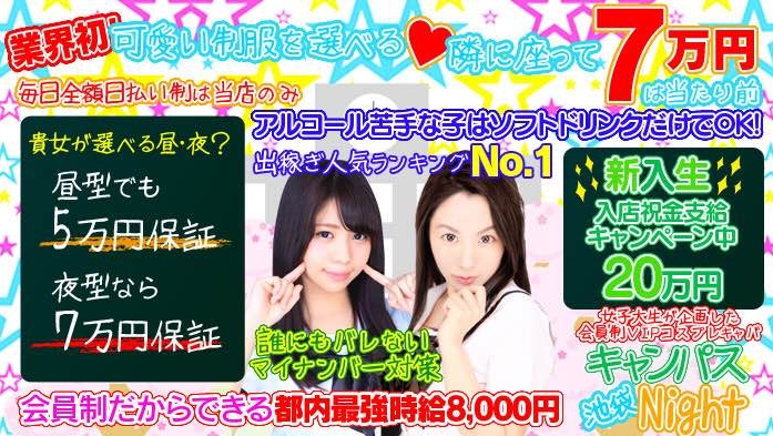 池袋の完全新規店「キャンパスNight」はいちゃキャバなので面倒なこと一切なしで稼げます。 「お話を聞いてあげるだけ」「ソフトドリンクだけでもOK」 キス・脱ぎ・お触りなし!完全NG3ないシステム完備! 同伴・ノルマ・アフターなどの心配も一切なくお仕事できます。 完全ニューオープンの綺麗な店内では、女の子同士の派閥は一切ないので、ストレスフリーでお仕事できます♪ お仕事内容自体も簡単なので、未経験者でも面接したその日に体験入店でき ますよ★