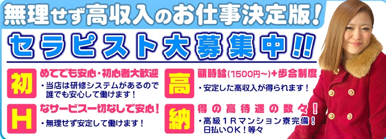 セラピスト大募集、今なら入店祝い金20,000円プレゼント ★平均時給3,000円 ★豪華差し入れあり ★送迎あり ★日払い可能 ★髪型自由 ★未経験大歓迎 ★寮完備 ★自由出勤 ★制服貸出 ★研修制度あり★染髪・エクステOK ★店内見学OK